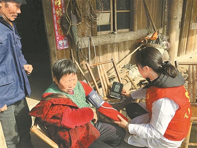 医务人员为村民量血压。(陈敏 唐慧晔 摄)